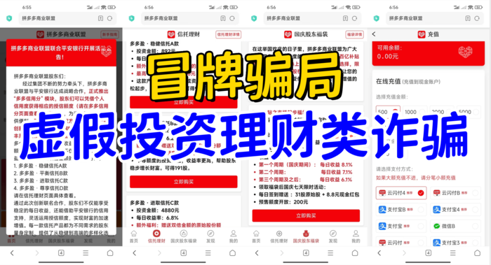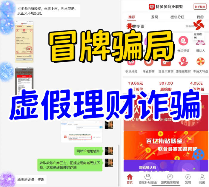 1、冒牌的“拼多多商業(yè)聯(lián)盟”APP:冒牌騙局,虛假投資理財(cái)類詐騙