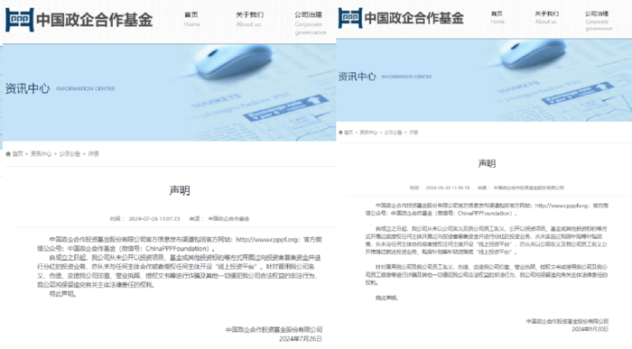 中國(guó)政企合作投資基金股份有限公司在官方網(wǎng)站多次發(fā)出《聲明》,稱從未與任何主體合作或者授權(quán)任何主體開設(shè)“線上投資平臺(tái)”。