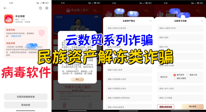 3、偽造的“中云存款”APP:帶病毒軟件,民族資產解凍類詐騙,云數貿系列詐騙。