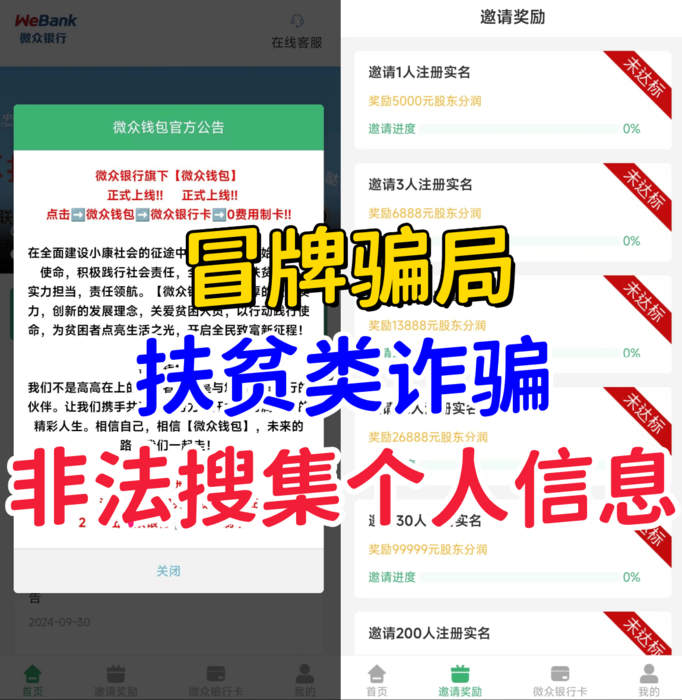 不法分子冒充微眾銀行的名義,虛構并散布涉詐APP,該項目打著扶貧的名義,宣傳免費注冊,邀請新人注冊送現金的旗號,引誘不明真相的人群參與,涉嫌非法搜集個人信息。