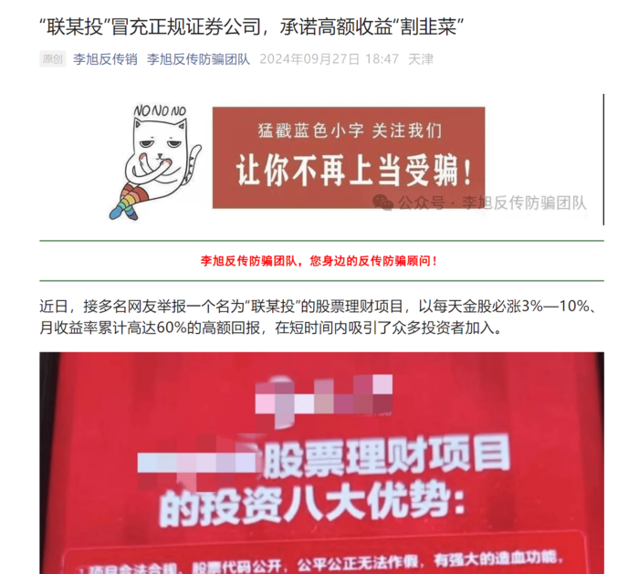 李旭反傳防騙團隊此前就發(fā)布相關文章《“聯某投”冒充正規(guī)證券公司,承諾高額收益“割韭菜”》