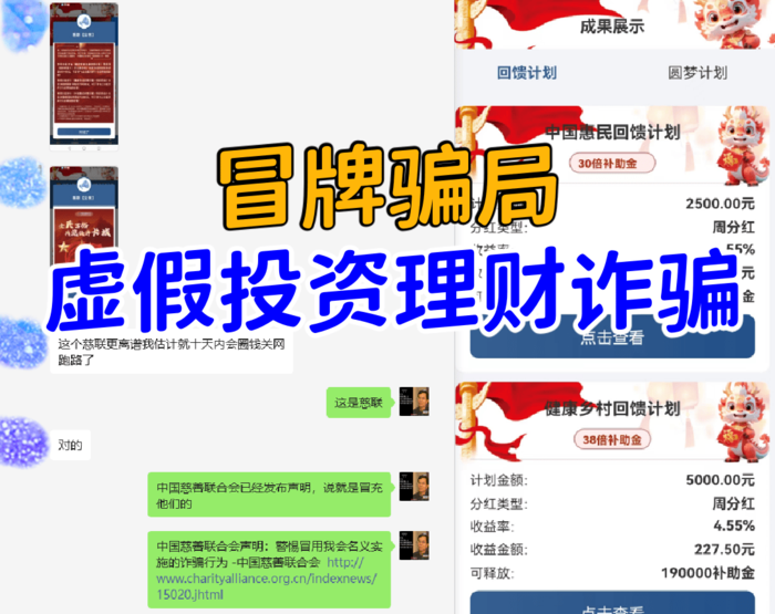 不法分子冒充“中國(guó)慈善聯(lián)合會(huì)”的名義,偽造并散布涉詐APP,虛構(gòu)理財(cái)項(xiàng)目實(shí)施詐騙活動(dòng)。