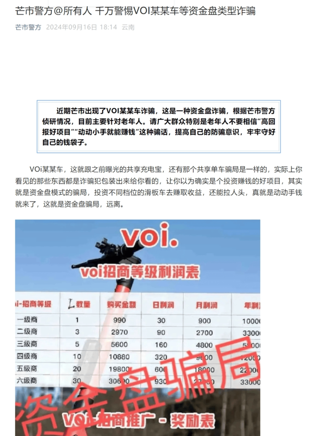 此前芒市警方就發(fā)布過(guò)公告《@所有人 千萬(wàn)警惕VOI某某車(chē)等資金盤(pán)類(lèi)型詐騙》。