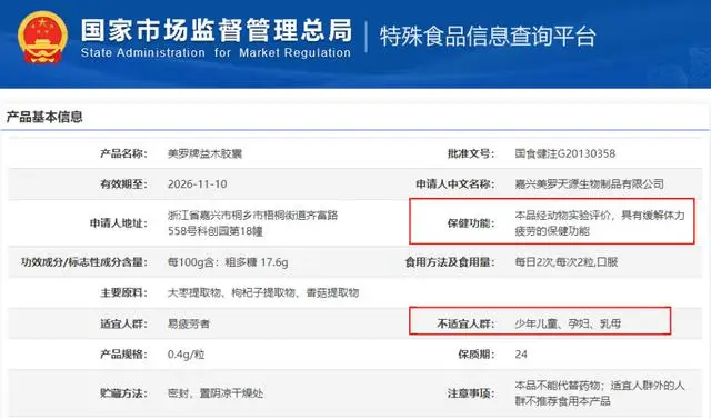 記者在國家市場監(jiān)督管理總局“特殊食品信息查詢平臺(tái)”查詢發(fā)現(xiàn),該公司有9款“藍(lán)帽子”產(chǎn)品,其中兩款含靈芝菌絲體粉的產(chǎn)品功效分別為免疫調(diào)節(jié)和耐缺氧、調(diào)節(jié)血脂,其他幾款產(chǎn)品功效為緩解體力疲勞,瓶身均注明了“本品不能代替藥物”。