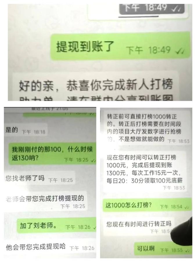 鑒于第一天的順利回款,項目大廳內也在實時滾動轉正人員名單,萌萌欣然答應。隨后,客服便推來一位數據指導老師,指導老師稱新人第一次打榜100元,返還130元,第二次1000元,返還1300元。