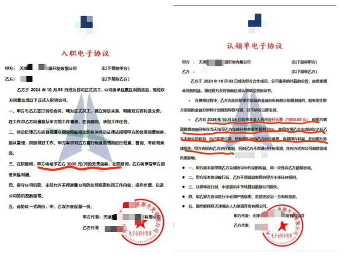 隨即,對方與萌萌簽訂了電子合同,雙方約定,作為正式員工,每天可得100元工資,每個月3000元無責底薪,每筆任務傭金15元。