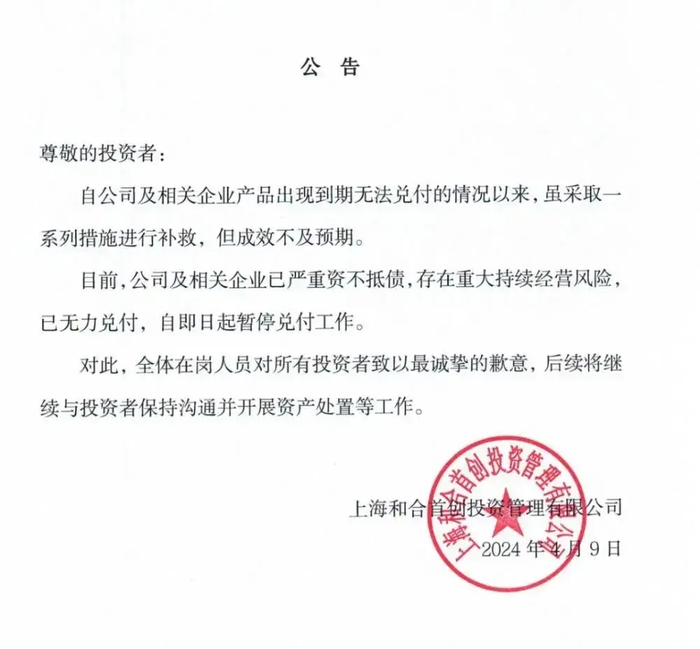 圖源/公司官網(wǎng) 和合首創(chuàng)成立于2016年1月,注冊(cè)資本10億元。以股權(quán)投資基金、證券投資基金、票據(jù)投資基金、地產(chǎn)基金、海外資產(chǎn)配置、家族信托等多元業(yè)務(wù)為基礎(chǔ),通過股權(quán)母基金、私募證券投資基金、EAM平臺(tái)等主體進(jìn)行投資。 和合首創(chuàng)、和合資產(chǎn)管理(上海)有限公司和合期貨三家公司并稱為“和合系”,和合資管是和合期貨的全資子公司。林強(qiáng)也是和合期貨三大合伙人之一,2021年,林強(qiáng)全面收購(gòu)了和合期貨,成為實(shí)控人。 公開資料顯示,林強(qiáng)畢業(yè)于上海交通大學(xué)國(guó)際經(jīng)濟(jì)與貿(mào)易專業(yè),獲得上海交通大學(xué)EMBA碩士學(xué)位、北京大學(xué)DBA博士學(xué)位。林強(qiáng)擁有十多年金融行業(yè)從業(yè)經(jīng)驗(yàn),曾任職于國(guó)泰人壽、國(guó)金證券、國(guó)金基金等大型金融機(jī)構(gòu)。2021年,林強(qiáng)獲選“陸家嘴金融城十大杰出青年”。 此前宣布爆雷,無(wú)法兌付 2024年4月9日,和合首創(chuàng)發(fā)布致投資者的公告,稱“已嚴(yán)重資不抵債,存在重大持續(xù)經(jīng)營(yíng)風(fēng)險(xiǎn)已無(wú)力兌付,自即日起暫停兌付工作”。