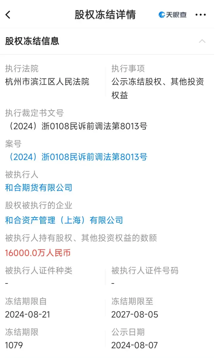 1.6億元股權(quán)被凍結(jié) 據(jù)天眼查,2024年8月,和合資產(chǎn)管理(上海)公司旗下有1.6億元股權(quán)被凍結(jié)。