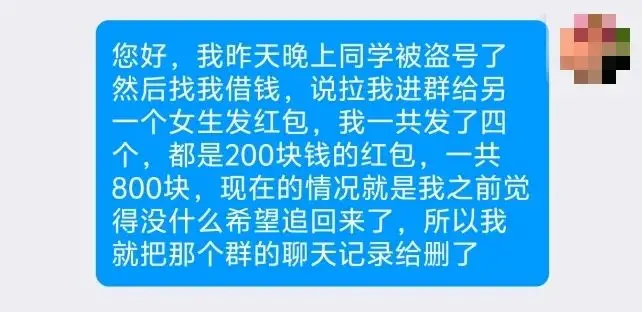2024年10月7日,小美(化名)在QQ上收到“假”同學(xué)的信息,謊稱急需用錢,讓小美進(jìn)QQ群發(fā)紅包給其朋友。轉(zhuǎn)完錢后,“假”同學(xué)就消失了,她才意識(shí)到自己被騙了。