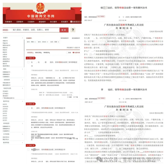 在中國裁判文書網(wǎng)上,涉及桂林臨桂“33500”的傳銷判決比比皆是,如若真的是國家項(xiàng)目,為何一而再再而三被打擊?如果真的賺錢,上平臺的老總又為何悔不當(dāng)初,甚至付出生命?打擊傳銷任重道遠(yuǎn),望廣大群眾多方查證,小心謹(jǐn)慎,切莫相信傳銷“洗腦”話術(shù),造成不可挽回的后果。