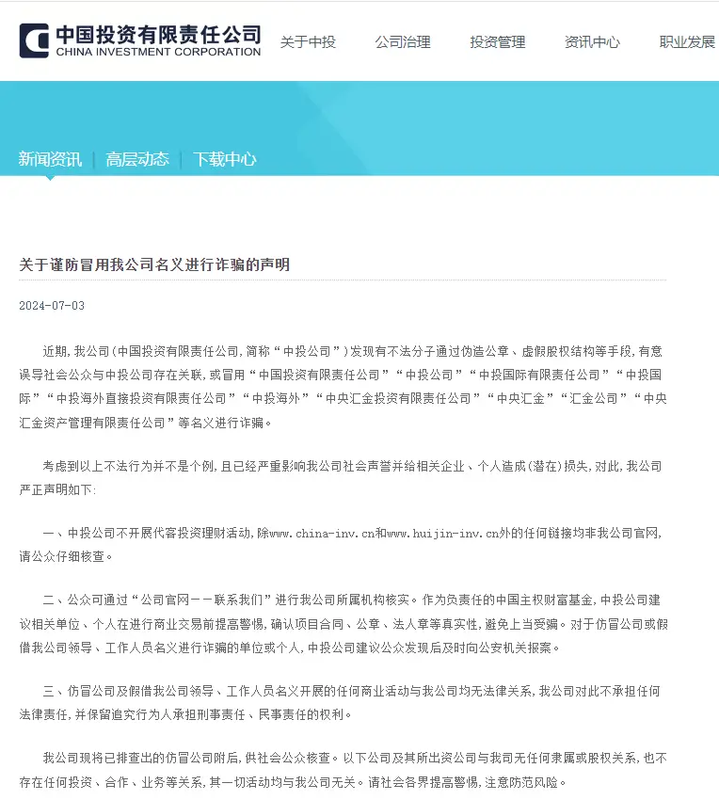 中國投資有限公司曾發(fā)布過《關(guān)于謹(jǐn)防冒用我公司名義進(jìn)行詐騙的聲明》,網(wǎng)友遇到任何投資理財項目,都要多方面求證,不要偏聽偏信。