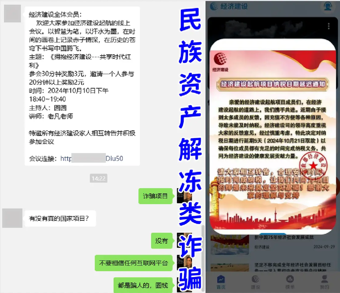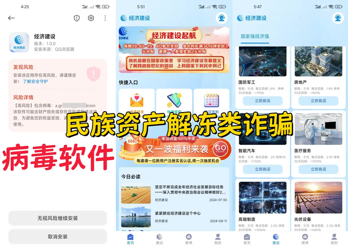 4、虛構(gòu)偽造的“經(jīng)濟建設(shè)”APP:病毒軟件,民族資產(chǎn)解凍類詐騙