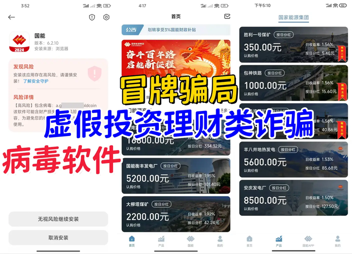 3、虛構(gòu)偽造的“國能”APP:病毒軟件,虛假投資理財類詐騙