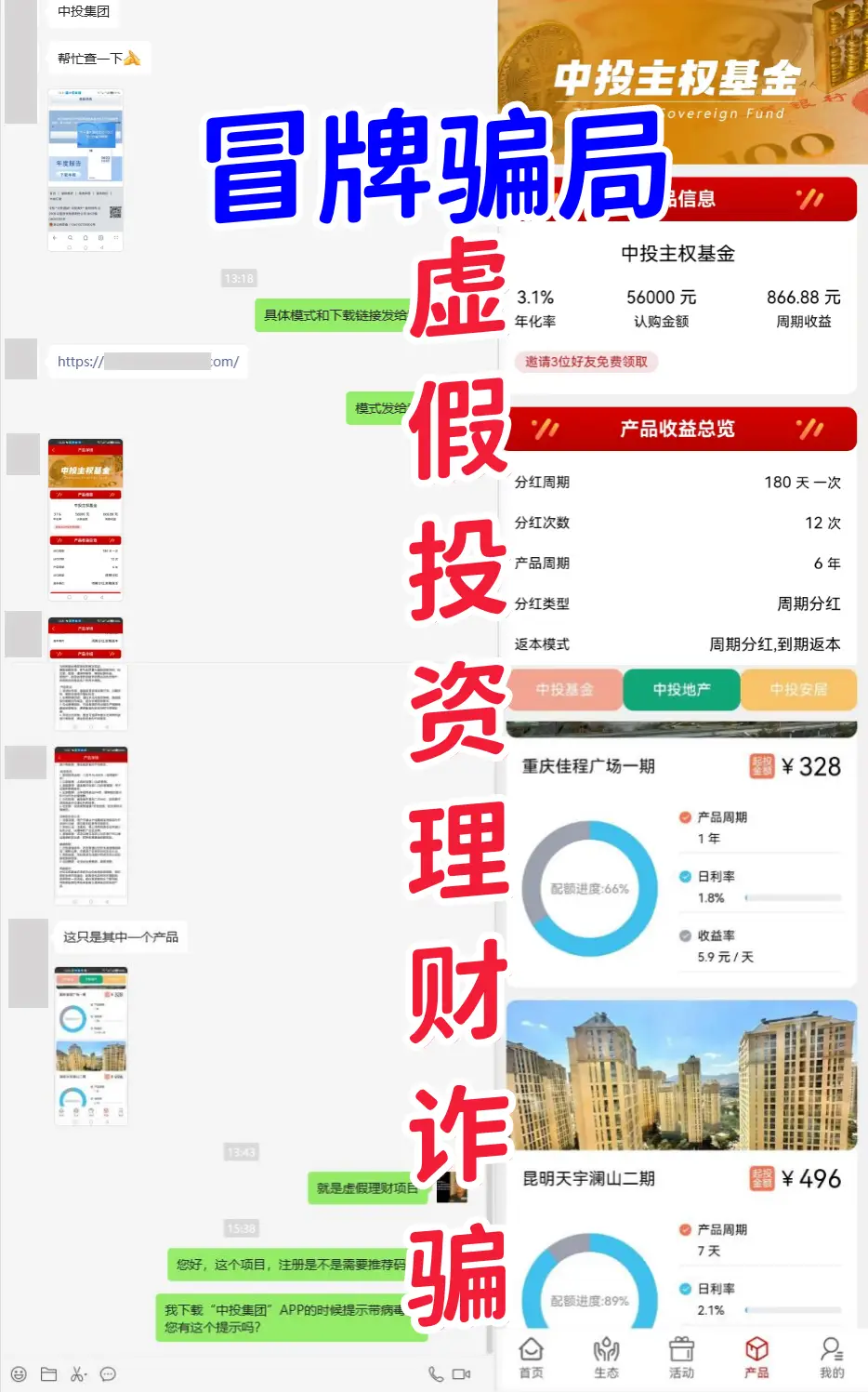 不法分子冒用央企“中國投資有限責(zé)任公司”的名義,制作散布涉詐APP,虛構(gòu)并推廣“中葳投主權(quán)基金”、“重慶佳程廣場一期”、“昆明天宇瀾山二期”等超高收益理財產(chǎn)品,實施詐騙活動。
