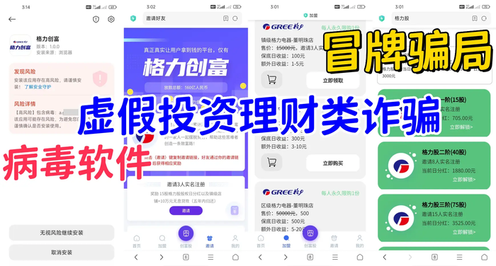 不法分子冒充“格力”公司的名義,制作散布涉詐APP,宣稱免費參與“格力股票”、免費“鎮(zhèn)級格力電器-董明珠店”、繳費加盟各個級別的“格力電器-董明珠店”,參與某些項目必須要發(fā)展下線才可以加入。