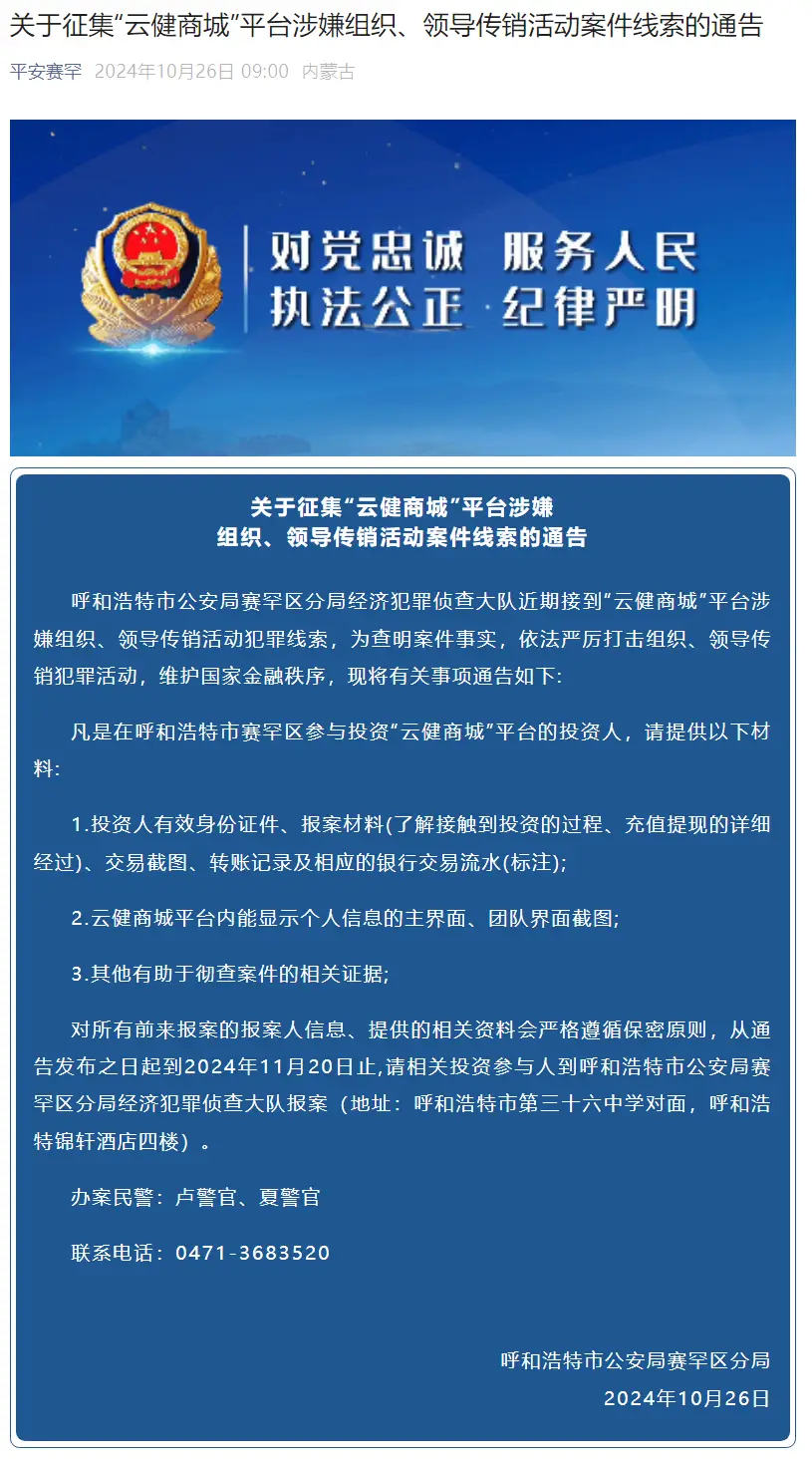 呼和浩特市公安局賽罕區(qū)分局經(jīng)濟(jì)犯罪偵查大隊(duì)近期接到“云健商城”平臺(tái)涉嫌組織、領(lǐng)導(dǎo)傳銷活動(dòng)犯罪線索,為查明案件事實(shí),依法嚴(yán)厲打擊組織、領(lǐng)導(dǎo)傳銷犯罪活動(dòng),維護(hù)國(guó)家金融秩序,現(xiàn)將有關(guān)事項(xiàng)通告如下:
