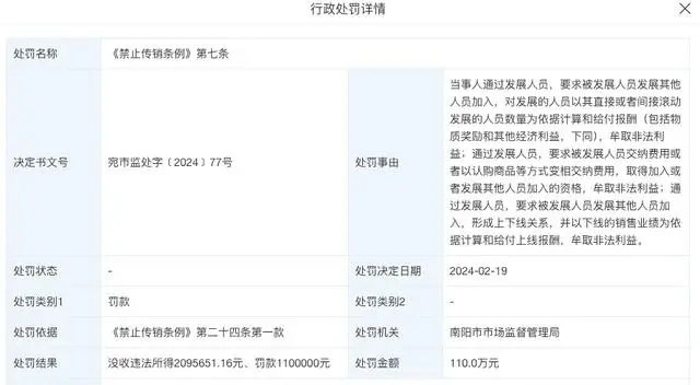 天眼查信息顯示,河北薈花電子商務有限公司曾在今年2月因涉嫌傳銷被南陽市場監(jiān)督管理局處罰過。處罰文書提到,“當事人通過發(fā)展人員,要求被發(fā)展人員發(fā)展其他人員加入,對發(fā)展的人員以其直接或者間接滾動發(fā)展的人員數(shù)量為依據(jù)計算和給付報酬,牟取非法利益”,薈花公司被沒收違法所得209萬余元、罰款110萬元。