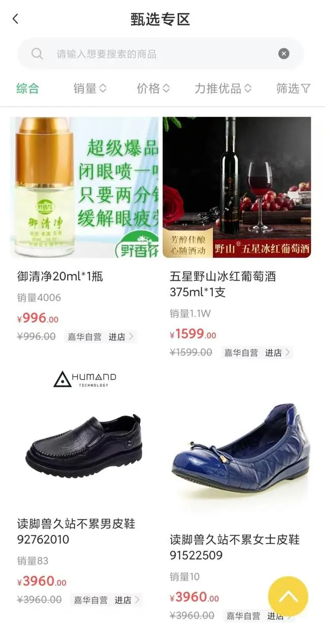 紅星新聞記者下載注冊了名為嘉華甄選2.0的APP,在“花果樂購”界面看到有商品正在銷售,絕大部分商品為皮鞋、運動鞋,價格3000多元一雙,還有一瓶20ml的噴霧售價996元,一瓶375ml的紅酒售價1599元。