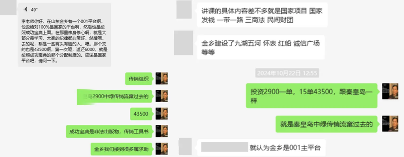 網(wǎng)友反饋,河北某地的一個(gè)傳銷組織因打擊,搬遷到了濟(jì)寧金鄉(xiāng),該傳銷組織打著“國(guó)家項(xiàng)目”“民間財(cái)團(tuán)”“一帶一路”的旗號(hào),鼓吹投資43500元賺好幾個(gè)億。