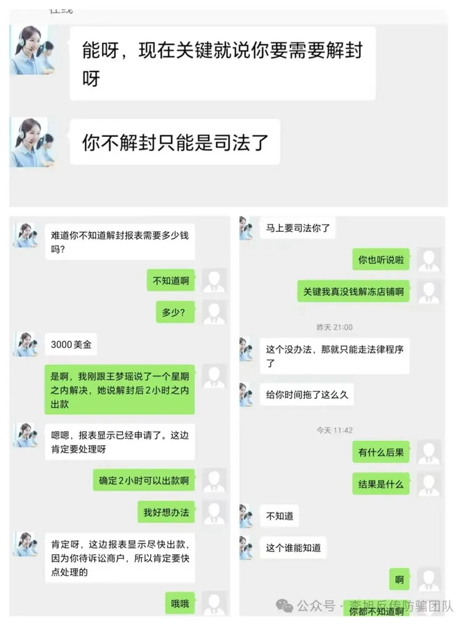網(wǎng)友開(kāi)店不到一個(gè)月的時(shí)間,由于墊資不足店鋪不斷降星最終被凍結(jié),在客服指導(dǎo)下繳納了2000美金保證金后又重啟店鋪,一但段時(shí)間后店鋪又被凍結(jié),這次客服要求再繳納3000美金解凍才可提現(xiàn)。網(wǎng)友沒(méi)錢(qián)解凍被客服威脅將進(jìn)入司法司法程序。