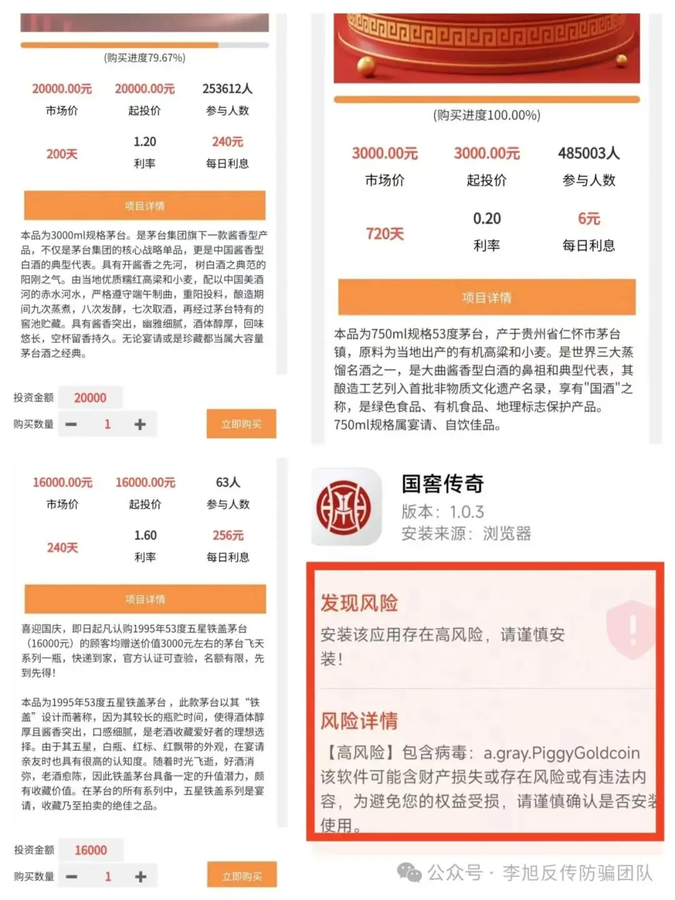 網(wǎng)友舉報(bào)該項(xiàng)目打著“貴州茅臺(tái)”旗號(hào),宣稱(chēng)投資一份1500元產(chǎn)品,可獲得4大福利,不但可以每天獲得收益,團(tuán)隊(duì)投資還可額外獲得投資大禮包。