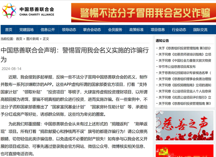 中國慈善聯(lián)合會在官方發(fā)布聲明,是不法分子冒用該公司的名義,開展的詐騙活動,可參與者從來不看,也不相信。