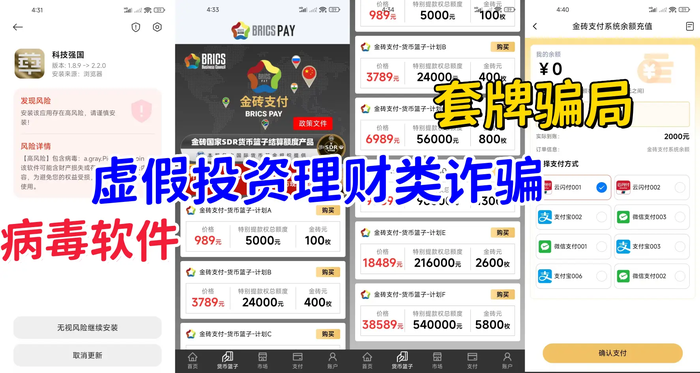 發(fā)表時(shí)間:2024-11-06 11:41作者:李旭反傳銷來(lái)源:李旭反傳防騙團(tuán)隊(duì) 不法分子套用、冒用國(guó)家、知名企業(yè)等名義,制作散步涉詐APP,引誘不明真相的人群下載注冊(cè),涉詐APP虛構(gòu)推廣高額返利理財(cái)項(xiàng)目實(shí)施詐騙項(xiàng)目。 由于虛假投資理財(cái)類詐騙APP無(wú)法通過(guò)正規(guī)途徑在應(yīng)用市場(chǎng)上架,詐騙分子只能通過(guò)創(chuàng)建網(wǎng)址鏈接、發(fā)送APK安裝包或掃描二維碼的方式讓用戶下載安裝虛假投資理財(cái)APP或進(jìn)入虛假投資網(wǎng)站。 虛假投資平臺(tái)大多會(huì)要求受害人將資金轉(zhuǎn)賬到指定的個(gè)人賬戶或非當(dāng)前投資平臺(tái)的對(duì)公賬戶,而正規(guī)的交易平臺(tái)只能轉(zhuǎn)賬到開設(shè)的專用對(duì)公賬戶。 一:套牌騙局——資金盤套牌的“科技強(qiáng)國(guó)”APP:病毒軟件 網(wǎng)友反饋,朋友讓我買金磚分紅利息高,說(shuō)是國(guó)家辦的科技強(qiáng)國(guó),是不是真的? 根據(jù)網(wǎng)友提供的資料,該項(xiàng)目冒用某公司的名義,推廣“金磚支付-貨幣籃子”“人工智能3.0”“數(shù)智未來(lái)”等高額返利項(xiàng)目,參與其中,收取款賬戶為第三方。