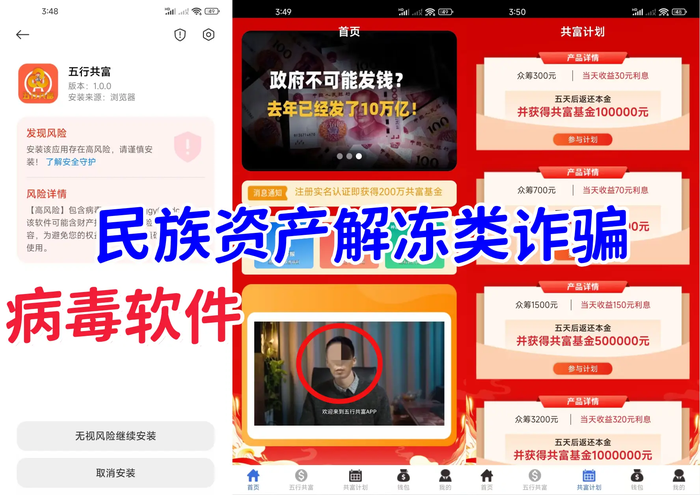 小編根據(jù)網(wǎng)友提供的資料查詢發(fā)現(xiàn),正規(guī)的應(yīng)用商城壓根沒有這么一個(gè)APP。想要下載,只能通過(guò)第三方鏈接、下載鏈接下載。 查詢得知下載鏈接的IP地址顯示在境外,下載時(shí)候提示該應(yīng)用未在相關(guān)部門備案,同時(shí)還提示該應(yīng)用帶病毒。 虛構(gòu)的“五行共富”:病毒軟件 網(wǎng)友反饋,身邊有些人總想著一步登天,一夜暴富,到處注冊(cè)參與亂七八糟的項(xiàng)目,這不有發(fā)來(lái)一個(gè)名為“五行共富”的項(xiàng)目,該項(xiàng)目宣傳市場(chǎng)注冊(cè)即可獲得200萬(wàn)的資金,邀請(qǐng)滿5個(gè)人可免費(fèi)提現(xiàn),簽到滿1個(gè)月送五行共富紀(jì)念幣,聲稱該幣純金打造,價(jià)值30萬(wàn),還發(fā)行了超高額返利的“共富計(jì)劃”理財(cái)項(xiàng)目。