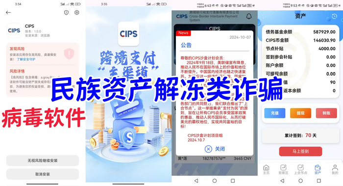 二:民族資產(chǎn)解凍類詐騙 虛構(gòu)的“CIPS沙盒計(jì)劃”APP:病毒軟件 網(wǎng)友求助,詢問(wèn)“CIPS沙盒計(jì)劃”是否真實(shí),該項(xiàng)目宣傳:CIPS是跨境支付主渠道,聲稱人民銀行直接統(tǒng)籌調(diào)撥3000億的專項(xiàng)資金,有負(fù)債的會(huì)員可以用于清繳債務(wù),給參與者發(fā)放50萬(wàn)的資金。