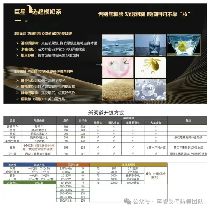 網(wǎng)友舉報(bào)該項(xiàng)目利用明星效益售賣(mài)某款超模奶茶,根據(jù)購(gòu)買(mǎi)件數(shù)將用戶分為會(huì)員、團(tuán)長(zhǎng)、戰(zhàn)略、聯(lián)創(chuàng)分銷(xiāo)商、股東、分公司幾個(gè)級(jí)別,享受不同的商品折扣,達(dá)到戰(zhàn)略級(jí)別享受推薦獎(jiǎng)和團(tuán)隊(duì)獎(jiǎng)金,成為聯(lián)創(chuàng)分銷(xiāo)商以上開(kāi)始享受業(yè)績(jī)累積獎(jiǎng)。該模式涉嫌多層級(jí)計(jì)酬,當(dāng)心!