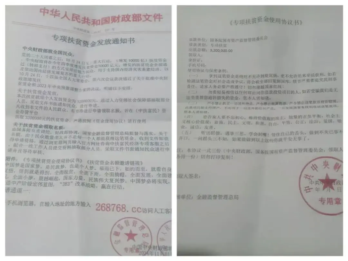 網(wǎng)友通過匿名快遞的方式收到印有公章的“專項扶貧資金發(fā)放通知書”,項目宣稱由財政部發(fā)放扶貧金,需要通過鏈接聯(lián)系客服領(lǐng)取。此通知書系假冒國家機關(guān)偽造公章實施詐騙。