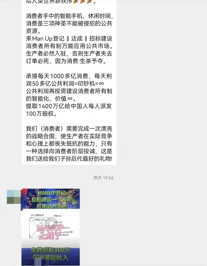 “云賬本”、“云庫房”推出的新面孔,宣稱提取1400萬億為每位國人派發(fā)100萬股權(quán),登記領(lǐng)取國民基礎(chǔ)收入。網(wǎng)友表示這位“老騙子”有跡象往精神控制型轉(zhuǎn)變,朋友被洗腦很深,每天都在發(fā)各種創(chuàng)業(yè)雞湯。