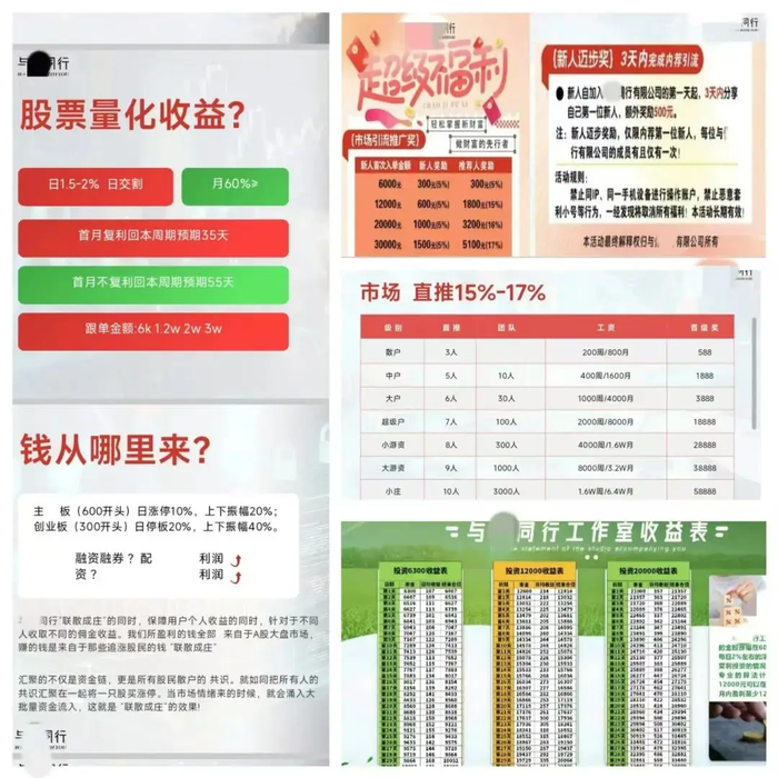 網(wǎng)友提供資料,平臺采用股票跟單制,跟單金額6千—3萬不等,宣稱日漲幅1.5%—2%,月漲幅大于60%。同時設(shè)立市場引流推廣獎、新人邁步獎等多種獎項,完成直推人數(shù)建立團隊還可獲得工資和晉級獎。