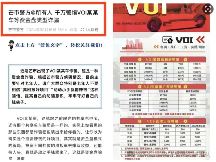 4、VIO滑板車 網(wǎng)友稱該平臺又推出了“共享太陽能電池板”項目,以2.6%的高額日利率引來眾多參與者投資,項目日益火爆。網(wǎng)友雖然表示已經(jīng)參與6個月,目前一切正常,但VOI某某車因涉嫌資金盤詐騙被芒市警方預(yù)警多次。