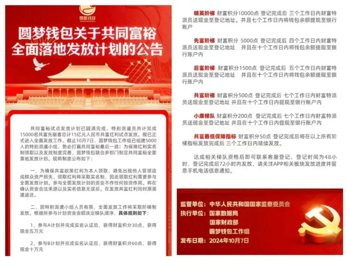 網(wǎng)友表示自己所屬店鋪的店長于日前卷款跑路,所有參與者連本金都無法收回。由于項目方十分狡猾,且受害者遍布全國各地,目前投訴無門,但項目仍有其他店鋪還在運行,每天開線上會議拉攏不明真相的新人加入。 民族資產(chǎn)解凍類詐騙 1、圓夢錢包: 該項目號稱只要購買“國債”就可獲利,揚言“投資2000元分紅100萬”,以發(fā)放“15億共富紅利”為誘餌,誘導(dǎo)參與者參與A、B、C計劃并實名注冊獲得財富積分和現(xiàn)金。今年年初,公安部公布的第一批民族資產(chǎn)解凍類詐騙項目及涉詐APP名稱中就包含該項目。目前該項目已無法提現(xiàn)。