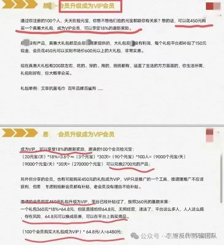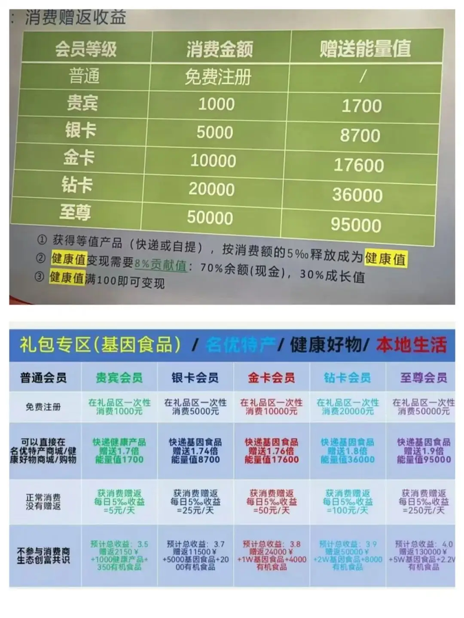 發(fā)表時間:2024-11-14 10:29作者:李旭反傳銷來源:李旭反傳防騙團隊 “莊家睜著眼,投資者閉著眼,真金白銀入局,輸光賠凈離場?!?/p> 一場信息不對稱的“跑得快”游戲,到底誰才是贏家呢? 典型的資金盤可以大致分成三個大類: 1、拆分盤 2、互助盤 3、刷單盤 但是無論哪種盤,起初都會以高額的回報誘導(dǎo)投資者加入,但是往往在幾次蠅頭小利之后,逐漸開始出現(xiàn)提現(xiàn)困難甚至直接關(guān)網(wǎng)跑路,一夜之間血本無歸的不在少數(shù),人們都會覺得自己一定是那個“跑得快”的“聰明人”。 但往往在貪念的作祟下越陷越深,面對各類資金盤詐騙,我們只要明確一點,資金的價值在于能夠促進生產(chǎn)和創(chuàng)造,單純的資金流轉(zhuǎn)不是真正的投資行為,而拉新人交錢即可分錢的行為,實質(zhì)上都是不法分子行騙的幫兇。 資金盤、網(wǎng)絡(luò)詐騙 1、京某科技 網(wǎng)友提供信息,該項目通過消費返利的模式,誘導(dǎo)用戶認(rèn)購“HGH”保健品進行投資并將消費額的5%釋放為健康值,滿100可變現(xiàn),變現(xiàn)需要8%貢獻(xiàn)值。 根據(jù)消費金額將用戶分為普通、貴賓、銀卡、金卡、鉆卡、至尊幾個等級贈送能量值,每天釋放,通過發(fā)展下線縮短釋放周期并獲得其他收益。