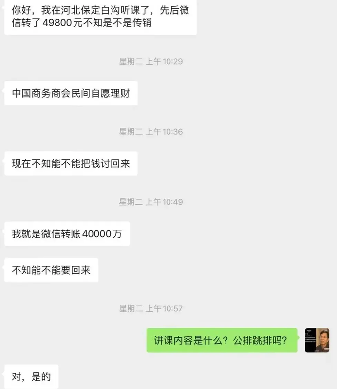 該傳銷組織打著“民間互助理財”、“商務(wù)商會運作”等旗號,采用公排跳排的模式發(fā)展下線。 3、西安紅利共商、共建、共贏 網(wǎng)友介紹該項目的三個方案,共商46000,共建136000,共贏88000。一個CE0帶三名CF0,共發(fā)展9名CP,橫向發(fā)展縱向收益。發(fā)展一名CP,CE0分3萬,CF0分1.6萬,滿盤再升級。CF0發(fā)展3名CP,升為CE0,即使沒有發(fā)展,盤滿后也可保本出局獲4.8萬。 推薦人原本承諾給網(wǎng)友下線放人,但至今一個人也沒有,本金也沒有收回。網(wǎng)友想要退錢,對方表示只有等人來頂替才能拿回本金。