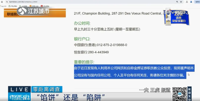 經(jīng)查詢,香港聯(lián)眾投資產(chǎn)管理有限公司成立于2023年11月10日,公司類別為私人股份有限公司,除此以外,沒有其他任何信息。 而所謂的“合作方”香港金輝證券,在其官網(wǎng)上,主頁最下方有一段重要提示:由于近日發(fā)現(xiàn)有人利用本公司網(wǎng)頁和自稱金輝證券職員教公眾投資,現(xiàn)鄭重聲明,本公司沒有與國內任何公司、個人及平臺有任何關連,請各位關注慎防詐騙。