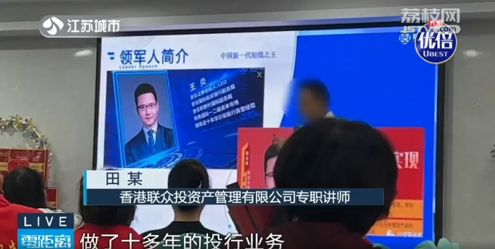 根據(jù)王先生提供的信息,10月18日上午,零距離記者前往高郵送橋鎮(zhèn)的“幸福大酒店”。一進門,就看到大廳里擺放著一個大招牌,抬頭為香港聯(lián)眾投資產(chǎn)管理有限公司,落款為高郵運營中心。11點左右,宴會廳已經(jīng)來了近百號人,一名姓田的男子走上舞臺,介紹聯(lián)眾投項目。 根據(jù)田姓男子的介紹,記者對項目有了大概的了解:香港聯(lián)眾投資產(chǎn)管理有限公司,與香港金輝證券合作,將散戶的錢集中到一起,這樣一來,散戶就變成了莊家,該項目的核心也就是:聚沙成塔,匯散成莊。 聯(lián)眾投專職講師田某: 雖然說不足以影響大盤,但是影響個股還是比較輕松的事情,既然能影響個股,在股市里掙錢就非常輕松。
