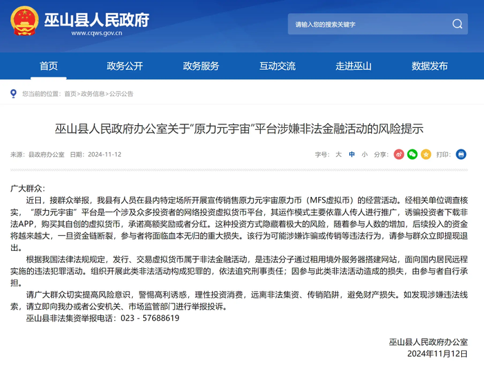 發(fā)表時(shí)間:2024-11-18 11:36作者:重慶金融安全衛(wèi)士來(lái)源:重慶金融安全衛(wèi)士 巫山縣人民政府辦公室關(guān)于“原力元宇宙”平臺(tái)涉嫌非法金融活動(dòng)的風(fēng)險(xiǎn)提示 廣大群眾: 近日,接群眾舉報(bào),我縣有人員在縣內(nèi)特定場(chǎng)所開(kāi)展宣傳銷(xiāo)售原力元宇宙原力幣(MFS虛擬幣)的經(jīng)營(yíng)活動(dòng)。經(jīng)相關(guān)單位調(diào)查核實(shí),“原力元宇宙”平臺(tái)是一個(gè)涉及眾多投資者的網(wǎng)絡(luò)投資虛擬貨幣平臺(tái),其運(yùn)作模式主要依靠人傳人進(jìn)行推廣,誘騙投資者下載非法APP,購(gòu)買(mǎi)其自創(chuàng)的虛擬貨幣,承諾高額獎(jiǎng)勵(lì)或者分紅。這種投資方式隱藏著極大的風(fēng)險(xiǎn),隨著參與人數(shù)的增加,后續(xù)投入的資金將越來(lái)越大,一旦資金鏈斷裂,參與者將面臨血本無(wú)歸的重大損失。該行為可能涉嫌詐騙或傳銷(xiāo)等違法行為,請(qǐng)參與群眾立即提現(xiàn)退出。 根據(jù)我國(guó)法律法規(guī)規(guī)定,發(fā)行、交易虛擬貨幣屬于非法金融活動(dòng),是違法分子通過(guò)租用境外服務(wù)器搭建網(wǎng)站,面向國(guó)內(nèi)居民遠(yuǎn)程實(shí)施的違法犯罪活動(dòng)。組織開(kāi)展此類(lèi)非法活動(dòng)構(gòu)成犯罪的,依法追究刑事責(zé)任;因參與此類(lèi)非法活動(dòng)造成的損失,由參與者自行承擔(dān)。 請(qǐng)廣大群眾切實(shí)提高風(fēng)險(xiǎn)意識(shí),警惕高利誘惑,理性投資消費(fèi),遠(yuǎn)離非法集資、傳銷(xiāo)陷阱,避免財(cái)產(chǎn)損失。如發(fā)現(xiàn)涉嫌違法線索,請(qǐng)立即向我辦或者公安機(jī)關(guān)、市場(chǎng)監(jiān)管部門(mén)進(jìn)行舉報(bào)投訴。 巫山縣非法集資舉報(bào)電話 巫山縣人民政府辦公室 2024年11月12日