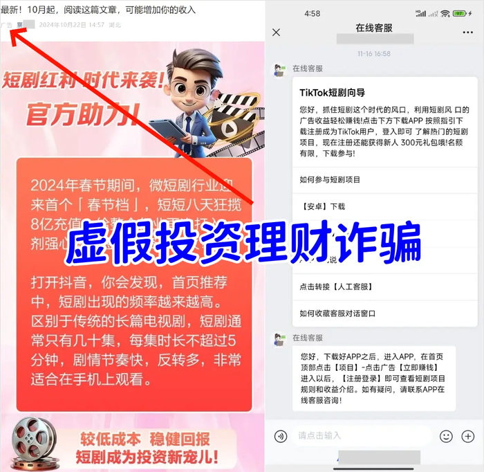 近期,有網(wǎng)友反饋,瀏覽文章時(shí)看到一則投資短劇的理財(cái)項(xiàng)目,該項(xiàng)目宣稱(chēng)是抖音旗下項(xiàng)目,無(wú)法判斷真?zhèn)?,希望我們能幫忙鑒定。