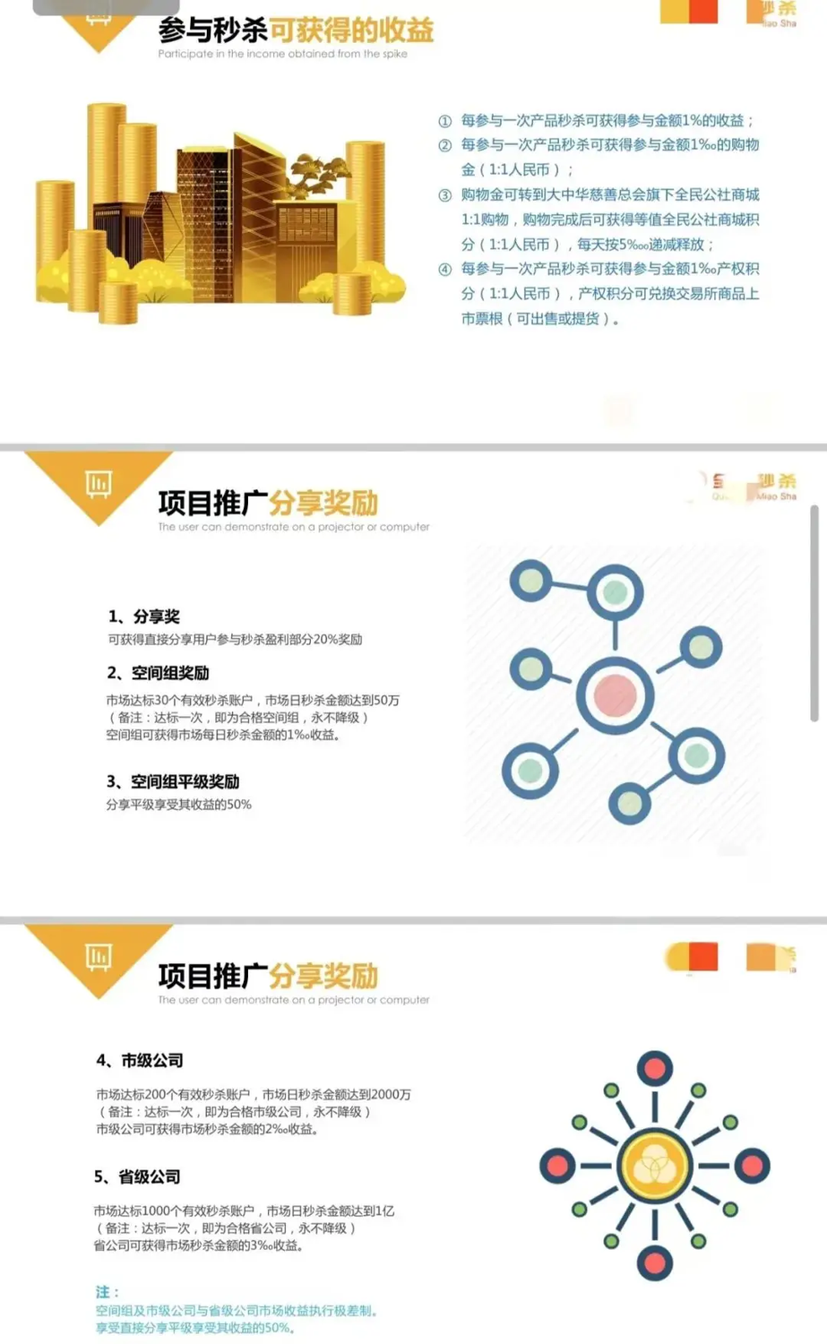 該平臺為一家興趣電商平臺,用戶繳納500元預(yù)約金預(yù)約當(dāng)天秒殺活動,活動結(jié)束后預(yù)約金可退。用戶每參與一次秒殺可獲參與金額1%收益、1‰購物金以及1‰產(chǎn)權(quán)積分。購物金可轉(zhuǎn)到全民公社商城購物1:1獲得積分。積分按照每天5‰遞減釋放。產(chǎn)權(quán)積分可兌換交易所商品上市票根。
