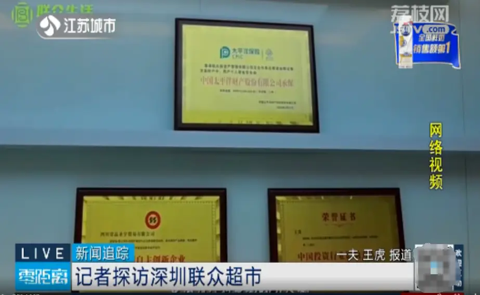這段網(wǎng)上流傳的視頻中,一位博主正在宣傳聯(lián)眾生活超市,視頻中的背景顯示了公司的全稱——聯(lián)眾超市深圳運(yùn)營(yíng)中心,公司懸掛著三塊招牌,其中一塊是太平洋保險(xiǎn)公司15億元的保單,還有一塊是授予王炎為中國(guó)投資影響力人物的榮譽(yù)證書,這兩塊招牌均已被證實(shí)為偽造。