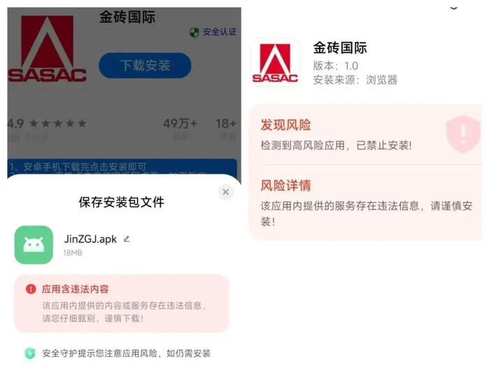 該APP只能通過連接下載,且被提示含有違法內(nèi)容,檢測(cè)到高風(fēng)險(xiǎn)。