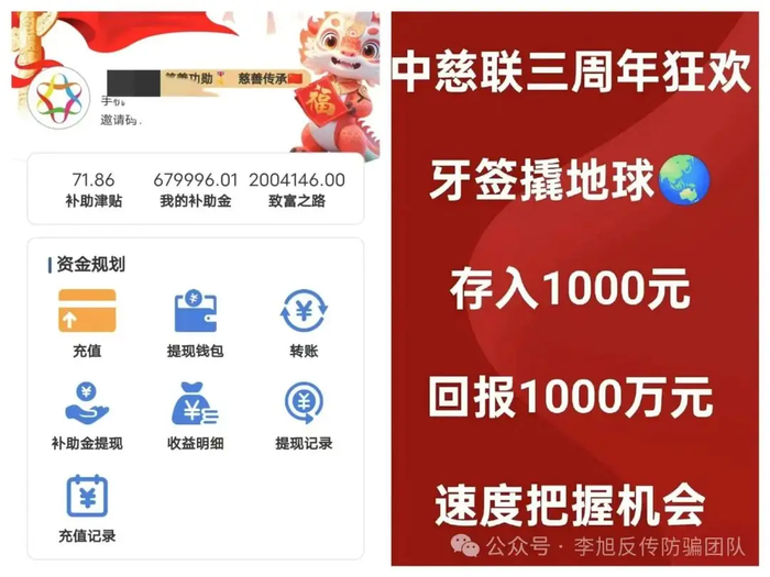 網(wǎng)友提供資料,“中慈聯(lián)”今日正在搞三周年慶典,號(hào)稱“牙簽撬地球”,存入1000元回報(bào)1000萬(wàn)元,不斷鼓動(dòng)用戶掏錢認(rèn)購(gòu)。