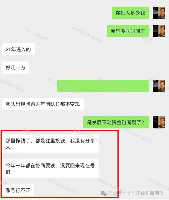 網(wǎng)友2021年投入幾十萬(wàn)元加入,因?yàn)闆](méi)有發(fā)展下線,一直在不斷投錢(qián),一年前團(tuán)隊(duì)出現(xiàn)問(wèn)題,一直無(wú)法變現(xiàn),上層人員相互推諉,網(wǎng)友不斷想辦法協(xié)商退錢(qián),但近日,錢(qián)沒(méi)有要回來(lái),賬號(hào)還被封禁無(wú)法打開(kāi),幾十萬(wàn)元全部損失。