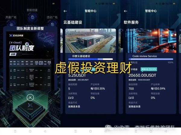 平臺(tái)擁有大量虛假投資理財(cái)項(xiàng)目誘導(dǎo)用戶投資,建立團(tuán)隊(duì),根據(jù)直推人數(shù)和持倉(cāng)數(shù)量晉升獲得獎(jiǎng)勵(lì)。