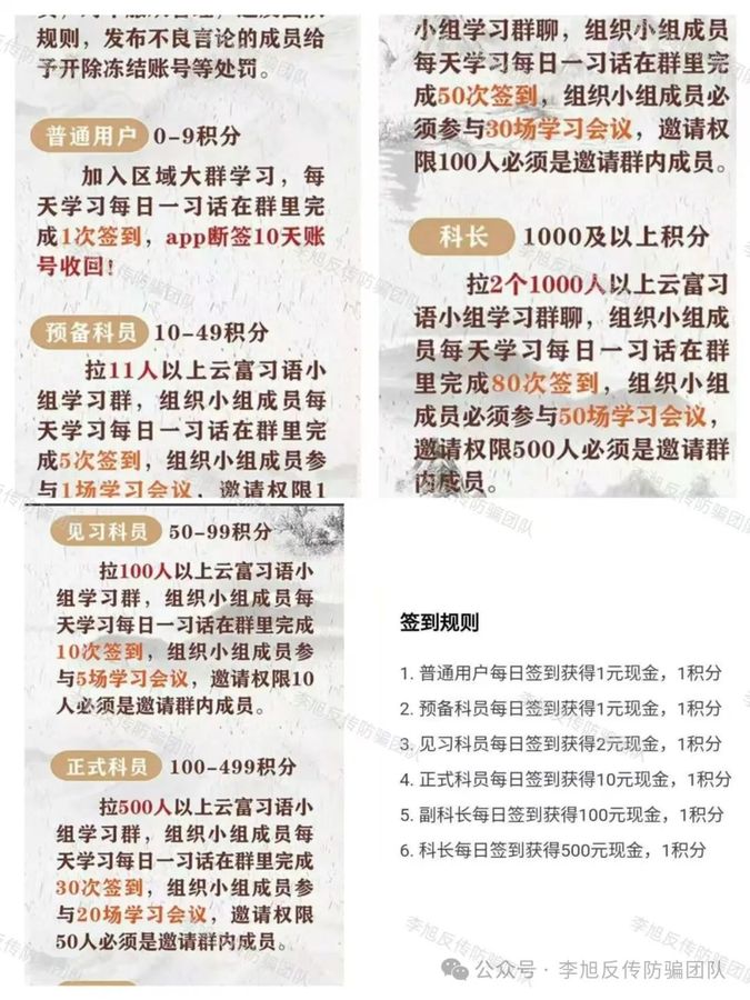發(fā)表時(shí)間:2024-12-21 11:22作者:李旭反傳銷來源:李旭反傳防騙團(tuán)隊(duì) 每到年底,都是各類項(xiàng)目“兌換諾言”的節(jié)點(diǎn) 年初夸下的海口、畫的餅都該逐一兌現(xiàn)了 “賣慘的”、“被攻擊的”、“不可抗力因素的”…… 一出出“好戲”陸續(xù)上演 想方設(shè)法一而再再而三的拖延時(shí)間 沒有好文采編故事的就干脆破罐破摔 留點(diǎn)面子的軟跑路 氣焰囂張的徹底“查無此人” 當(dāng)然,跑之前是一定要再坑一筆錢的 “解凍費(fèi)”、“手續(xù)費(fèi)”、“滯納金”、“升級(jí)福利”…… 總之,交錢的名頭多得很 但是,作為旁觀者,明明一眼假 參與者們卻樂在其中 只盯著項(xiàng)目方承諾的那串?dāng)?shù)“0”都得數(shù)一陣子的高額回報(bào) 卻絲毫不去計(jì)算自己已經(jīng)掏了多少錢 又為什么每到提現(xiàn)時(shí)刻就出公告? 要知道,銀行取錢轉(zhuǎn)賬每天都有限額了 怎么可能掃個(gè)碼就能到賬幾十萬(wàn)上百萬(wàn)呢? 而這些“保本高收益”的項(xiàng)目又為何追著趕著來送錢呢? 是“天選之子”,是“人中龍鳳”? 還是…… 李旭反傳防騙團(tuán)隊(duì)希望以每天的預(yù)警喚醒更多參與者 都是一輩子辛苦攢下的積蓄千萬(wàn)守護(hù)好 不要白白便宜了騙子,給騙子添了“油水” 以下這16個(gè)項(xiàng)目全是虛假項(xiàng)目,永遠(yuǎn)不會(huì)兌現(xiàn) 速速卸載及時(shí)止損 民族資產(chǎn)解凍類詐騙 1、虛構(gòu)的“中華習(xí)語(yǔ)”APP 注冊(cè)就給500萬(wàn),您相信么? 網(wǎng)友舉報(bào)平臺(tái)打著國(guó)家旗號(hào)宣稱實(shí)名注冊(cè)即可獲得500萬(wàn)專項(xiàng)基金,于2025年1月5日提現(xiàn)。邀請(qǐng)新成員注冊(cè)可享8萬(wàn)元現(xiàn)金及1億專項(xiàng)基金分紅。 ![]() 平臺(tái)將用戶分為普通用戶、預(yù)備科員、見習(xí)科員、正式科員、副科長(zhǎng)、科長(zhǎng)幾個(gè)級(jí)別,每日簽到獲得現(xiàn)金獎(jiǎng)勵(lì)和積分,根據(jù)不同級(jí)別拉相應(yīng)人數(shù)參與“云富習(xí)語(yǔ)小組”學(xué)習(xí),并組織團(tuán)隊(duì)完成相應(yīng)天數(shù)的簽到和學(xué)習(xí)會(huì)議才可完成考核,發(fā)放年終福利、每日津貼等等。 該項(xiàng)目并非國(guó)家項(xiàng)目,不要相信! ![]() 2、套牌“建行錢包”APP 平臺(tái)冒用“建設(shè)銀行”名義成立“建設(shè)銀行超級(jí)VIP會(huì)員”實(shí)名注冊(cè)獲得30萬(wàn)建行錢包兌換車和房產(chǎn),成為會(huì)員領(lǐng)取300萬(wàn)人民幣,簽到5-90天獲得翡翠、金條、汽車獎(jiǎng)勵(lì)。邀請(qǐng)一人獲得5萬(wàn)元數(shù)字人民幣,并根據(jù)一級(jí)、二級(jí)、三級(jí)發(fā)放1%-10%邀請(qǐng)收益。 ![]() 3、套牌的“人民資產(chǎn)”APP 人民數(shù)據(jù)公司發(fā)布多篇文章聲明,明確指出項(xiàng)目為詐騙,但項(xiàng)目方依舊憑借“每月發(fā)放5萬(wàn)現(xiàn)金”、“每年安排5次旅游”、“過年發(fā)放30萬(wàn)新年紅包”、“三代內(nèi)享受公務(wù)員待遇”吸引眾多中老年人參與。近日更是不斷忽悠用戶盡快完成數(shù)據(jù)資產(chǎn)變現(xiàn),12月25日即可領(lǐng)取50萬(wàn)現(xiàn)金獎(jiǎng)勵(lì)。目前還有幾天時(shí)間,讓我們一看看看“官方”如何自圓其說。 ![]() 4、虛構(gòu)的“萬(wàn)網(wǎng)歸一”APP 網(wǎng)友被平臺(tái)可進(jìn)行“報(bào)損補(bǔ)償”被吸引加入。平臺(tái)號(hào)稱所有參與互聯(lián)網(wǎng)投資的用戶都可進(jìn)行2024年度現(xiàn)金免費(fèi)提現(xiàn),推薦獎(jiǎng)勵(lì)按照1級(jí)、2級(jí)、3級(jí)發(fā)放3%-10%。但是,當(dāng)我們根據(jù)網(wǎng)友提供鏈接下載APP便提示高風(fēng)險(xiǎn)。同時(shí),提現(xiàn)不過邀人加入是幌子,推出所謂的“福利產(chǎn)品”誘導(dǎo)用戶投資才是真實(shí)目的。 ![]() 5、虛構(gòu)的“中國(guó)地票”APP 網(wǎng)友于今年6月經(jīng)熟人介紹參與其中,每晚七點(diǎn)上線聽課,有專人教授用戶如何投資,網(wǎng)友不想投資,但推薦人墊資800元強(qiáng)行為網(wǎng)友注冊(cè),7天后確實(shí)連本帶利返還。網(wǎng)友見此放松警惕,在推薦人不斷慫恿下,花費(fèi)3800元認(rèn)購(gòu)“抗美援朝地票”。但項(xiàng)目于8月突然被封。 ![]() 今年11月,“中國(guó)地票”更名“全民地票”再一次出現(xiàn)。推薦人又一次慫恿網(wǎng)友參與。 在軟件內(nèi)部,有大量虛構(gòu)的地票投資項(xiàng)目供用戶選擇。但根據(jù)網(wǎng)友提供的下載鏈接下載該APP時(shí),提示高風(fēng)險(xiǎn)且攜帶病毒。 ![]() 6、虛構(gòu)的“中國(guó)養(yǎng)老”APP ![]() 7、虛構(gòu)的“擴(kuò)大內(nèi)需”APP ![]() 網(wǎng)絡(luò)傳銷詐騙 1、來某哦(逸某能源、峰某和) 該項(xiàng)目名字非常之多,逸某能源、峰某和、租某里均屬于同一項(xiàng)目,李旭反傳防騙團(tuán)隊(duì)也曾預(yù)警多次。 該項(xiàng)目花費(fèi)3980原購(gòu)買一組電池,沒有實(shí)物卻每天返現(xiàn)15元,并獲得雙倍積分。 開設(shè)區(qū)縣、市級(jí)加盟渠道,繳納20-50萬(wàn)加盟費(fèi)后,可獲得股權(quán)、推介獎(jiǎng)勵(lì)、管理服務(wù)費(fèi)、門店流水、等多項(xiàng)獎(jiǎng)勵(lì)政策。大量用戶為求最大收益,不斷拉人頭拉資金投入。 ![]() 2、“匯某達(dá)”股票跟投