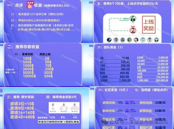 發(fā)表時間:2025-04-09 14:21作者:李旭反傳防騙團(tuán)隊來源:李旭反傳防騙團(tuán)隊 “天上不會掉餡餅,但地上卻總有人挖陷阱……” TA們或許打著“愛心”“夢想”的旗號,或許承諾“一夜暴富”,但是揭開表象,真相往往令人心驚。 生活從來不會因為一次“投機(jī)”而變得更好,但卻可能因為一次輕信墜入深淵。面對種種誘惑,不妨多問一句:“這真的可信么?” 今天這些所謂的“機(jī)遇”正把“手”伸向你的錢袋子,趕緊刪除! 民族資產(chǎn)解凍類詐騙 1 虛構(gòu)的“旭東方”APP 打著發(fā)放“疫情補(bǔ)助”旗號,宣稱提供身份證、銀行卡等詳細(xì)個人信息可領(lǐng)取12萬疫苗補(bǔ)助金。該APP下載提示未備案且存在高風(fēng)險。 ![]() 2 虛構(gòu)的“國民振興”APP 以為參與過“中國夢”項目被騙的人發(fā)放168萬援助金吸引人們實名注冊下載,并根據(jù)要求完成“愛心捐贈”流程,獲得“證書”后可提現(xiàn)“扶貧款”。該項目系詐騙,切莫相信。 ![]() 3 假冒的“善某集團(tuán)”鳥巢發(fā)錢大會 網(wǎng)友舉報,該平臺以“善某集團(tuán)分公司”名義要求人們實名注冊成為會員,繳納99元購買統(tǒng)一服裝后可前往鳥巢領(lǐng)取現(xiàn)金。推薦新人獎勵5萬元現(xiàn)金和新款手機(jī)。其套路與“立夫基金會”幾乎一模一樣,都是假的! ![]() 4 虛構(gòu)的“國家債行” 打著“解債”旗號,承諾“百萬年薪”忽悠人們加入。 相關(guān)閱讀《抓獲16人,涉案資產(chǎn)近千萬!某律以2.5折“解債”為幌子實施非法吸收公眾存款犯罪活動》 《欠了錢,有人幫你“化債解債”?注意了!這是新型非法集資》 ![]() 資金盤、虛假投資理財詐騙 1 哈姆(HAHM) 利用虛擬幣的刷單類型詐騙,下載挖礦軟件注冊哈姆任務(wù)點評賬戶,充值USDT解鎖每天任務(wù),傭金為押金的2.5%-4%,提現(xiàn)支付3%,帶有洗錢色彩。另設(shè)見點獎等多個推薦獎勵,符合傳銷特征。 ![]() 2 買某有喜 商務(wù)推廣員需支付198元購買M1級別資格,通過推薦返現(xiàn)、團(tuán)隊提成發(fā)展下線商務(wù),強(qiáng)調(diào)“分享越多收益越高”的裂變機(jī)制。自稱為“支付寶”服務(wù)商,但并未公示與“支付寶”官方合作協(xié)議,身份存疑。 ![]() 3 FEC電子優(yōu)惠券 雖名為“電子優(yōu)惠券”,但具備區(qū)塊鏈代幣特征,DOS與FEC的兌換比例為1:98,具有“代幣發(fā)行融資”嫌疑。以“空投節(jié)點”為獎勵核心,需通過消費(fèi)或積累FEC獲取收益,消費(fèi)者使用FEC支付時扣除10%用于鑄造空投節(jié)點,(每1萬個FEC鑄造1個)且節(jié)點獎勵分期發(fā)放,恐涉嫌非法集資、變相傳銷。 ![]() 4 拾某匯 虛擬幣跟投平臺,U進(jìn)U出,新人根據(jù)首存金額獲贈財運(yùn)金獎勵,推薦人及上級均可獲得相應(yīng)獎勵。設(shè)立10個層級,根據(jù)團(tuán)隊人數(shù)晉升,享周期分紅和晉升獎勵。網(wǎng)友表示,參與者大多為中老年人。該項目通過虛擬幣交易屬非法金融活動,涉嫌非法集資、傳銷。 ![]() 5 景德鎮(zhèn)某版權(quán)交易中心 打著“景德鎮(zhèn)某版權(quán)交易中心”旗號推出瓷器版權(quán)交易項目,根據(jù)不同消費(fèi)金額設(shè)置不同利率,目前7天周期利率為15‰;每天僅點一點收藏即可獲得B積分,分享收益30%;根據(jù)分享人數(shù)和總業(yè)績設(shè)立7個VIP等級,享最高40%收益,另設(shè)分紅加權(quán)獎勵。該模式靜態(tài)增值返利涉嫌非法集資,動態(tài)拉人頭多層級計酬涉嫌傳銷。 ![]() 6 UNILIVE 下載“Unilive”APP后,頁面看似是一個短視頻平臺,但通過“發(fā)現(xiàn)”進(jìn)入“opensee”界面,便來到了項目的“主戰(zhàn)場”。初始“SEE”為500個,用戶通過完成評論、點贊、關(guān)注等每日任務(wù)還可獲得5個“SEE”。這些“SEE”可賣出,但需要匹配一定額度。用戶拿出一部分“SEE”為星標(biāo)主播打賞獲得額度(1SEE對應(yīng)20額度)。在匹配足夠額度后將SEE賣出,利潤通過usdt轉(zhuǎn)出。 ![]() 該項目雖然披上了直播的外衣,實則還是一個虛擬幣交易平臺。在我國,任何虛擬幣交易均屬非法金融活動,資金不受法律保護(hù),所有損失自行承擔(dān)。 ![]() ,實則還是一個虛擬 網(wǎng)絡(luò)傳銷詐騙 1 麥某證券 網(wǎng)友舉報,自己在某公眾號被誘導(dǎo)添加陌生好友,隨后對方冒充證券從業(yè)人員要求網(wǎng)友下載“YO信”進(jìn)行股票跟投項目,并承諾每日收益10%。網(wǎng)友聽信對方話術(shù),下載后按照所謂的“證券公司經(jīng)理”要求,將資金轉(zhuǎn)入不同個人賬戶完成充值。隨后接到反詐中心電話,認(rèn)定其為詐騙。立案后,賬戶被鎖定,共計損失6.5萬元。 ![]() 異地聚集式傳銷 1 廣西南寧69800 以“資本運(yùn)作”為口號,以“北部灣經(jīng)濟(jì)區(qū)”“專供大米油”“地王大廈”等證明自己為“國家政策”。要求參與者投資69800元后返現(xiàn)19000元,采用“五級三晉制”發(fā)展下線,達(dá)到29人規(guī)模升為老總,每月拿6位數(shù)底薪,回報達(dá)980萬強(qiáng)制出局。 網(wǎng)友被家人以“做生意”為由帶至該地,發(fā)現(xiàn)家人在4個月的時間里已經(jīng)被徹底“洗腦”,試圖發(fā)展其為下線。 ![]() 2 秦皇島中綠 網(wǎng)友朋友去年被騙去該地7天后,因聽信對方“洗腦話術(shù)”加入該組織。在短暫歸家后再次前往。該傳銷組織打著“國家項目”、