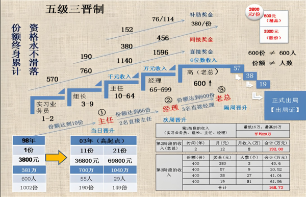 這套傳銷(xiāo)模式以“五級(jí)三晉制”為核心,從底層的實(shí)習(xí)業(yè)務(wù)員,逐步攀升至業(yè)務(wù)組長(zhǎng)、業(yè)務(wù)主任、業(yè)務(wù)經(jīng)理,直至金字塔頂端的高級(jí)業(yè)務(wù)員(俗稱“老總”)。他們拋出極具誘惑性的投資規(guī)則:每張身份證僅能投資一單,首份3800元,后續(xù)30份每份3300元,湊齊31份總計(jì)102800元算作一單,投入后能返還30400元。只需成功發(fā)展3個(gè)下線,借助幾何倍增原理,就能實(shí)現(xiàn)層級(jí)的跨越。按照他們的說(shuō)法,只要拉到19個(gè)人加入,份額累計(jì)達(dá)到600份,就能登上“二平臺(tái)”,每月輕松斬獲六位數(shù)的收入。短短兩到三年“出局”時(shí),更能獲得高達(dá)1380萬(wàn)的巨額回報(bào)。